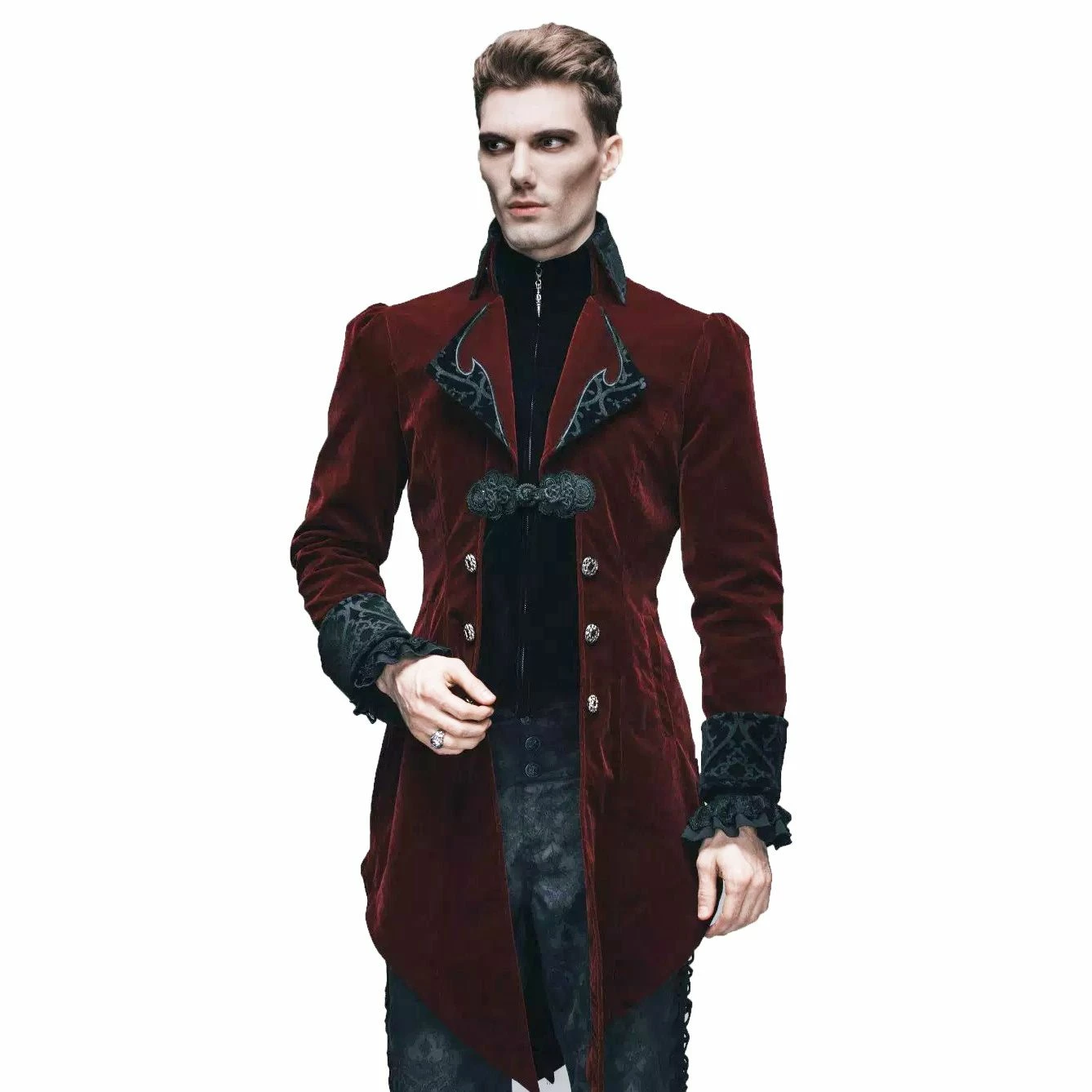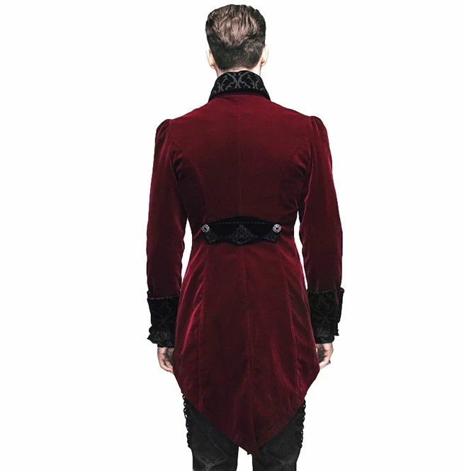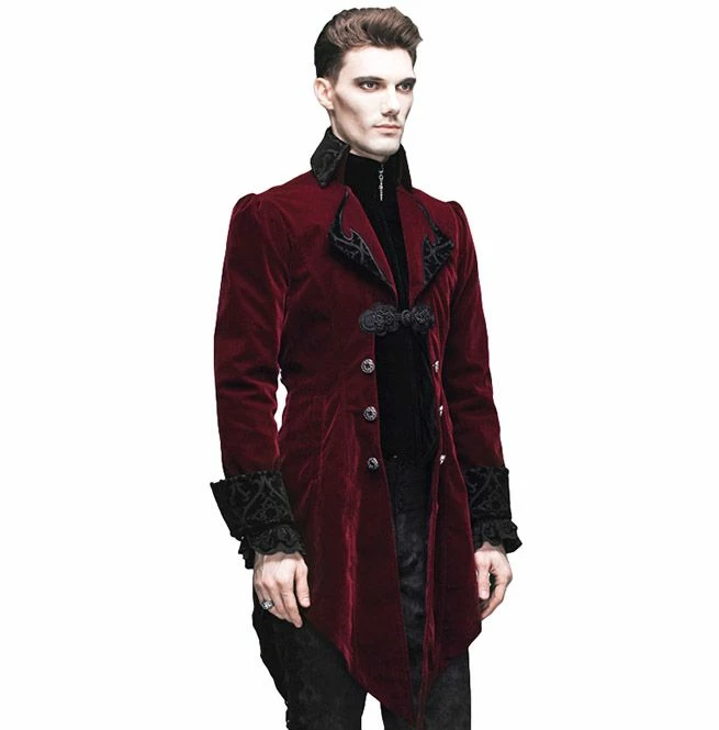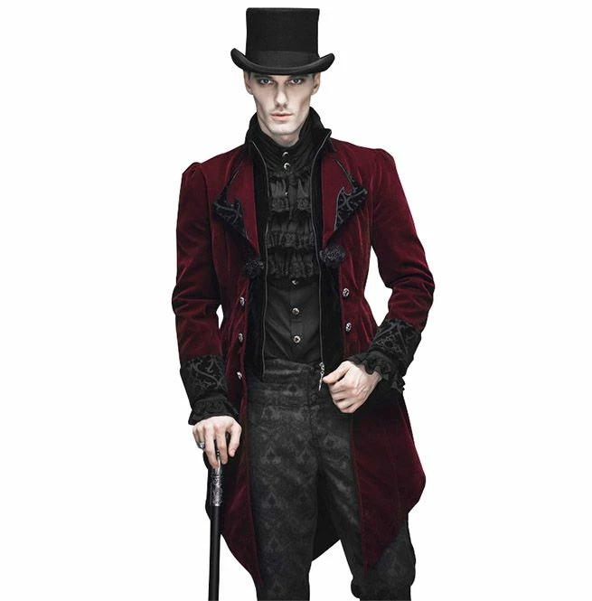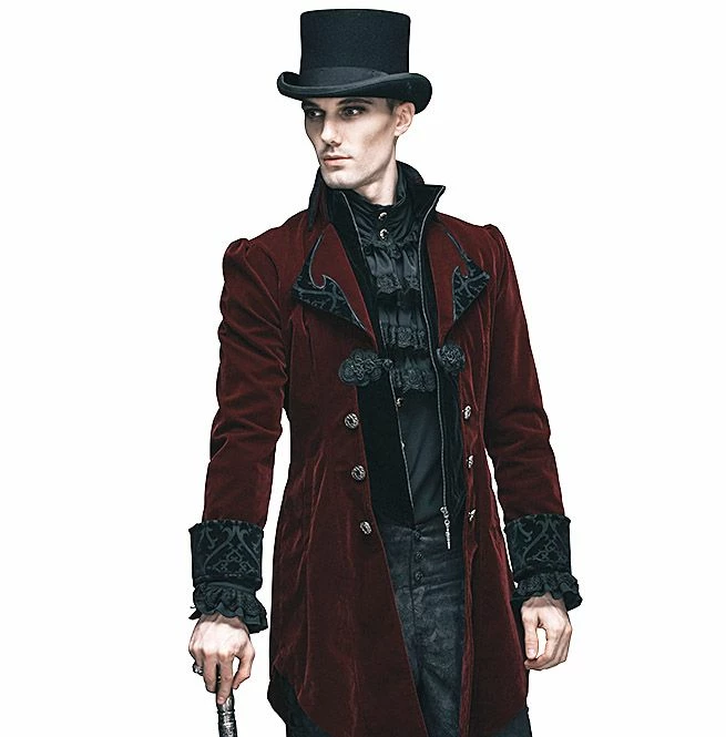 A unique Victoria Gothic inspired tailcoat featuring a long split swallowtail, cutaway front, button fastening at the waist and black satin effect finish. It also has a patterned design on the collars and cuffs.