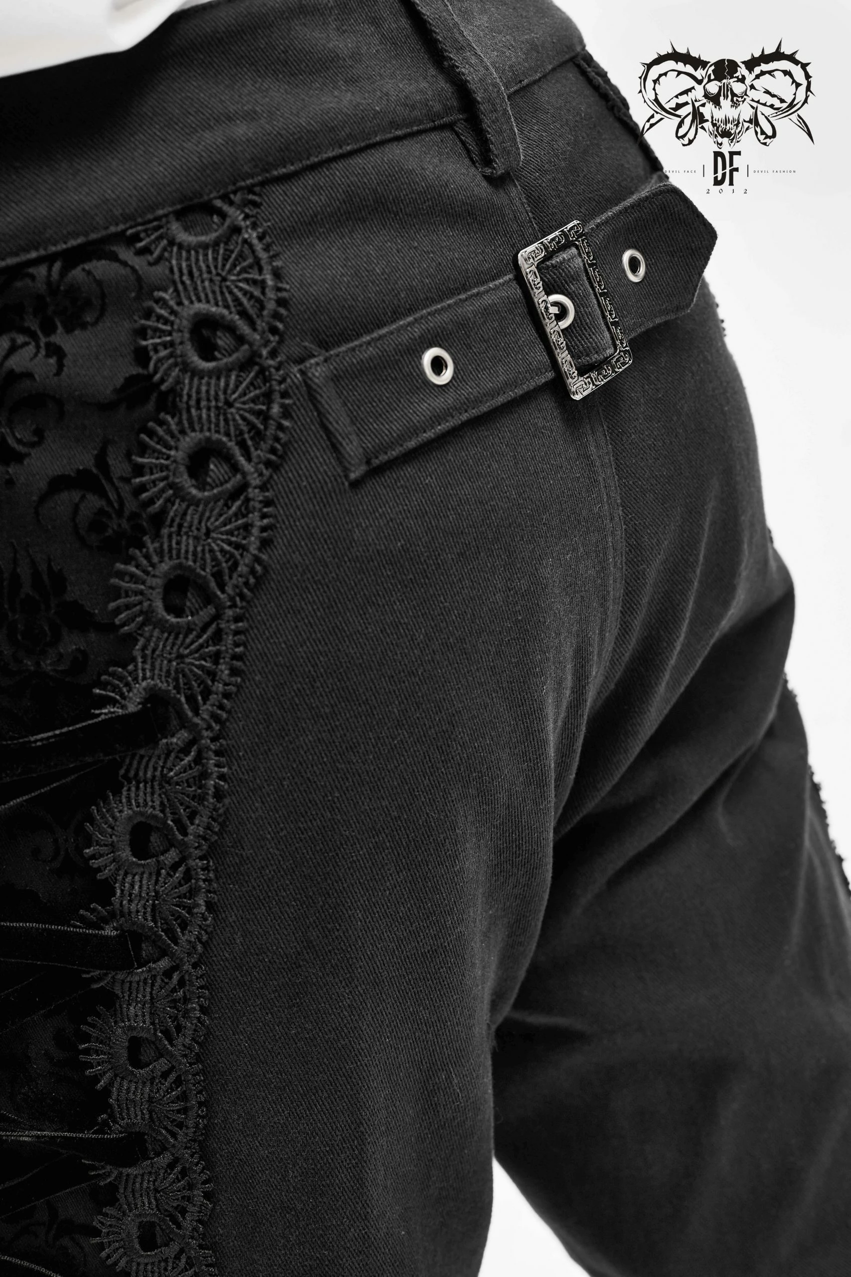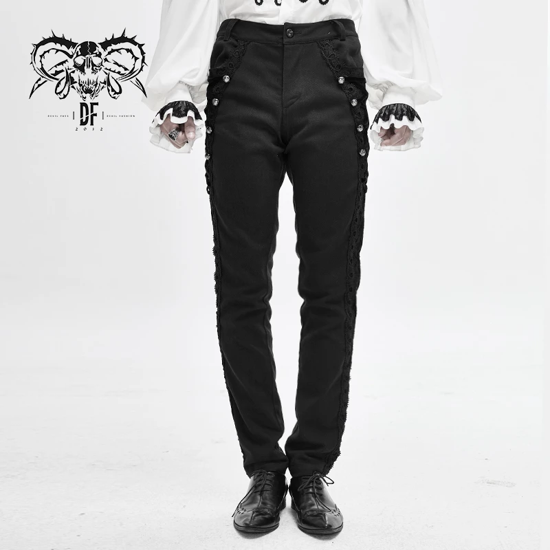 This men’s gothic pants has some old school feel to it’s design. It features a patchwork design with embroidery and jacquard prints dominating the sides. It also has a button closure with decorative metal rivets surrounding the pockets. The pants also have a buckle strap design at the back. Wear this with a gothic waistcoat and ruffled shirt when out on festivals, hangouts, events, parties and casual settings. Pair it up with black ankle boots.