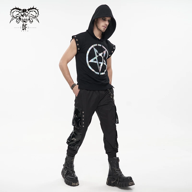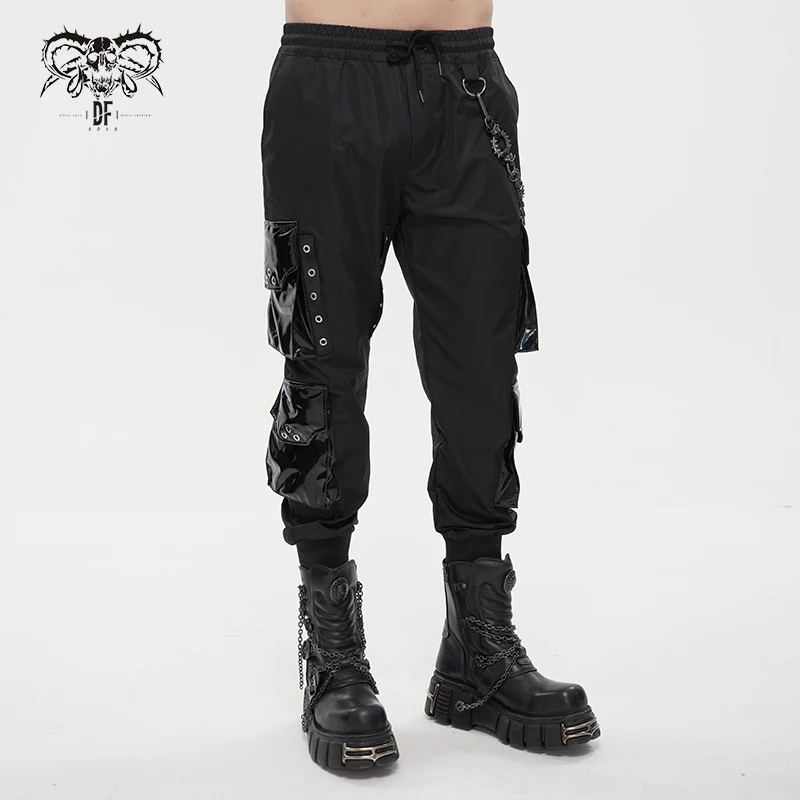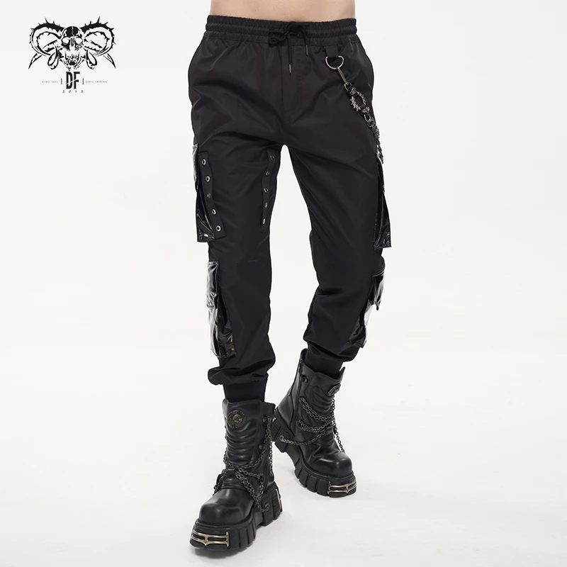 They feature double PU Leather pockets patchwork on both sides with metal holes and hanging chain detail.
