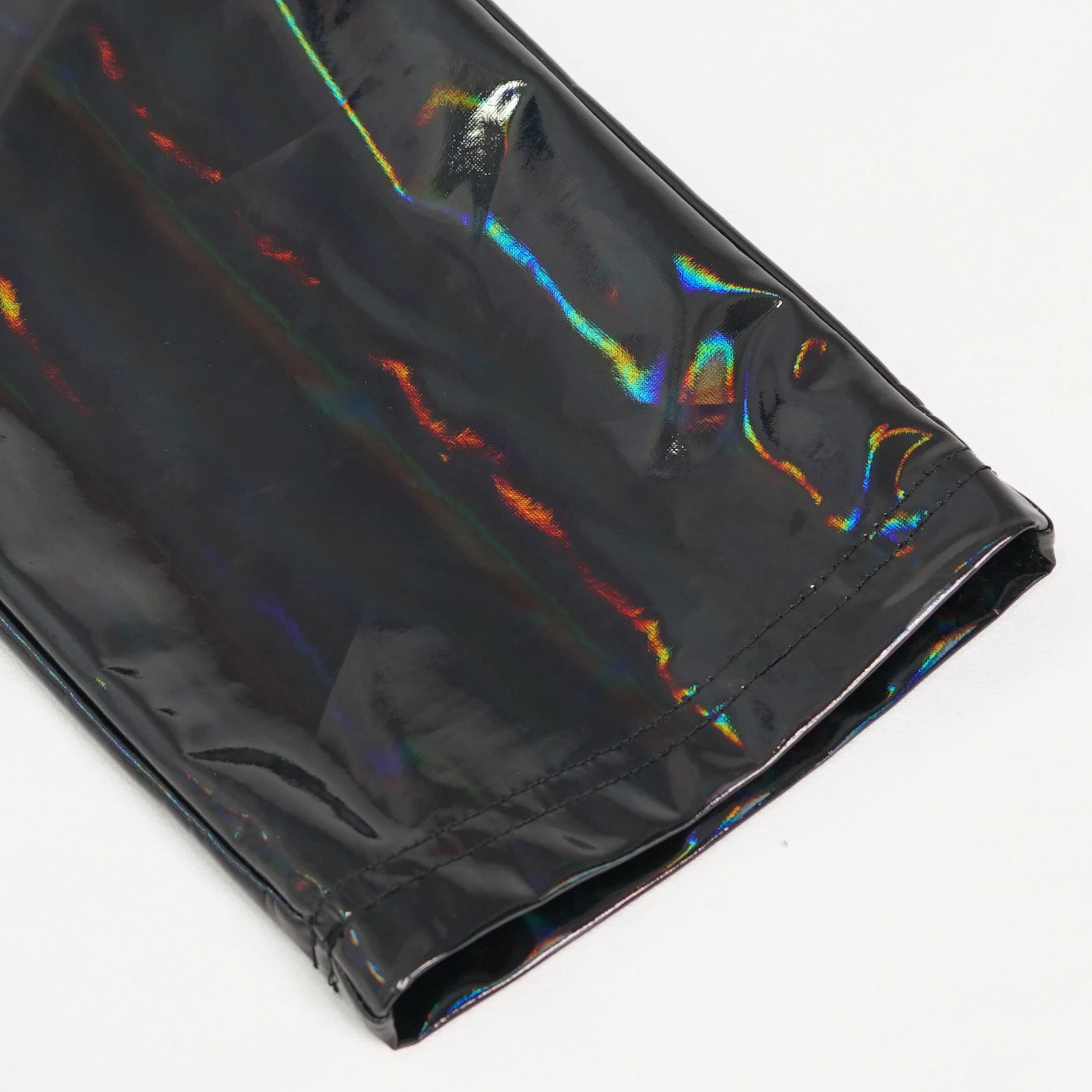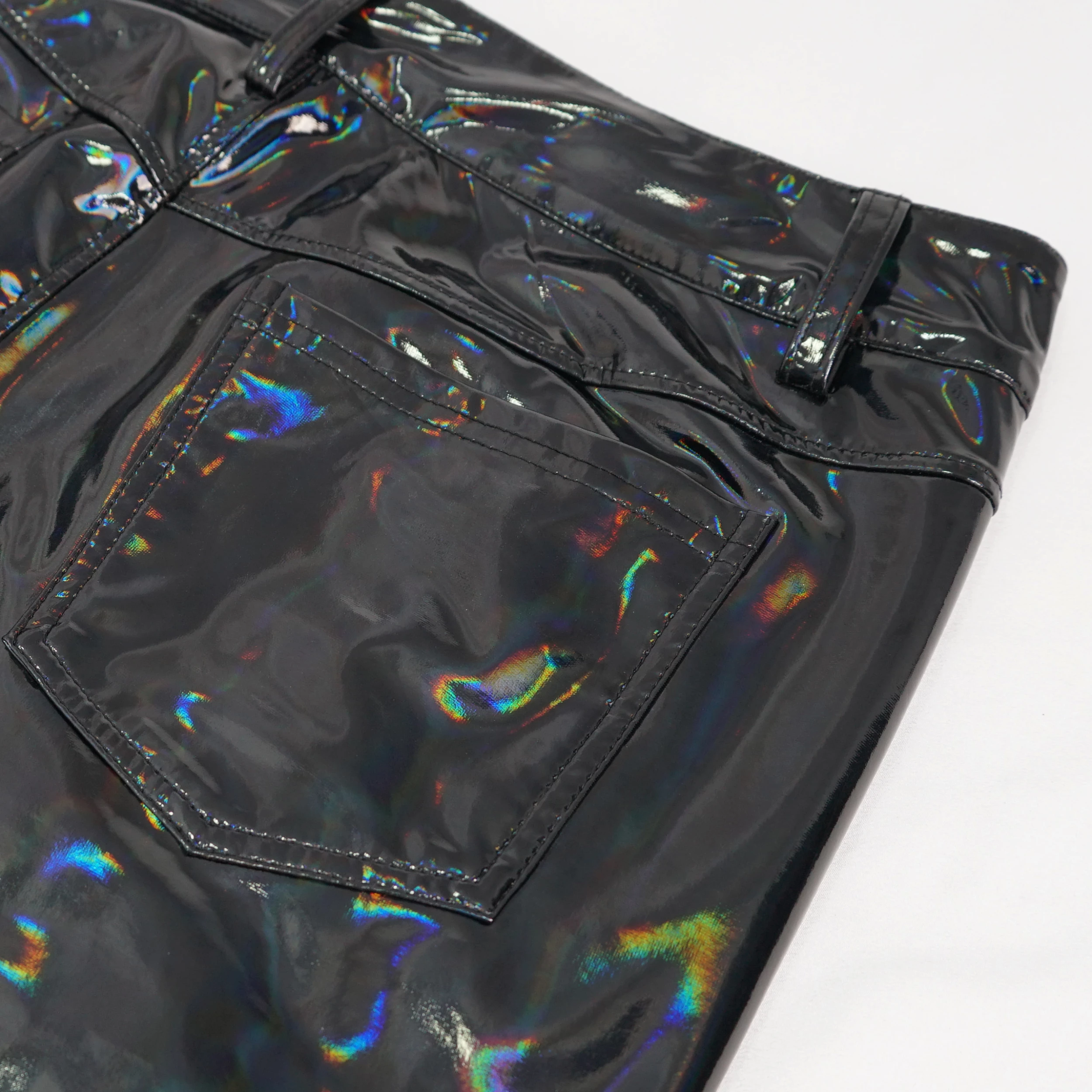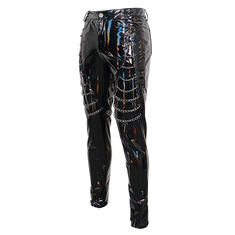 This Punk Eyelets Patent Leather Chain Pant is easy to wear featuring a pull-on closure.